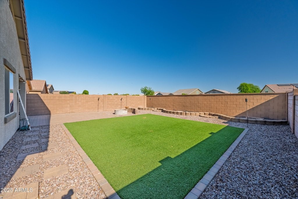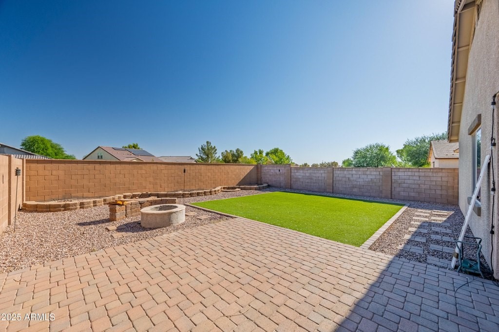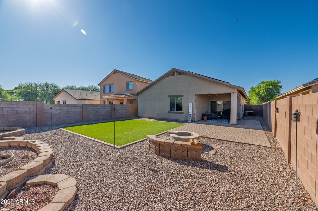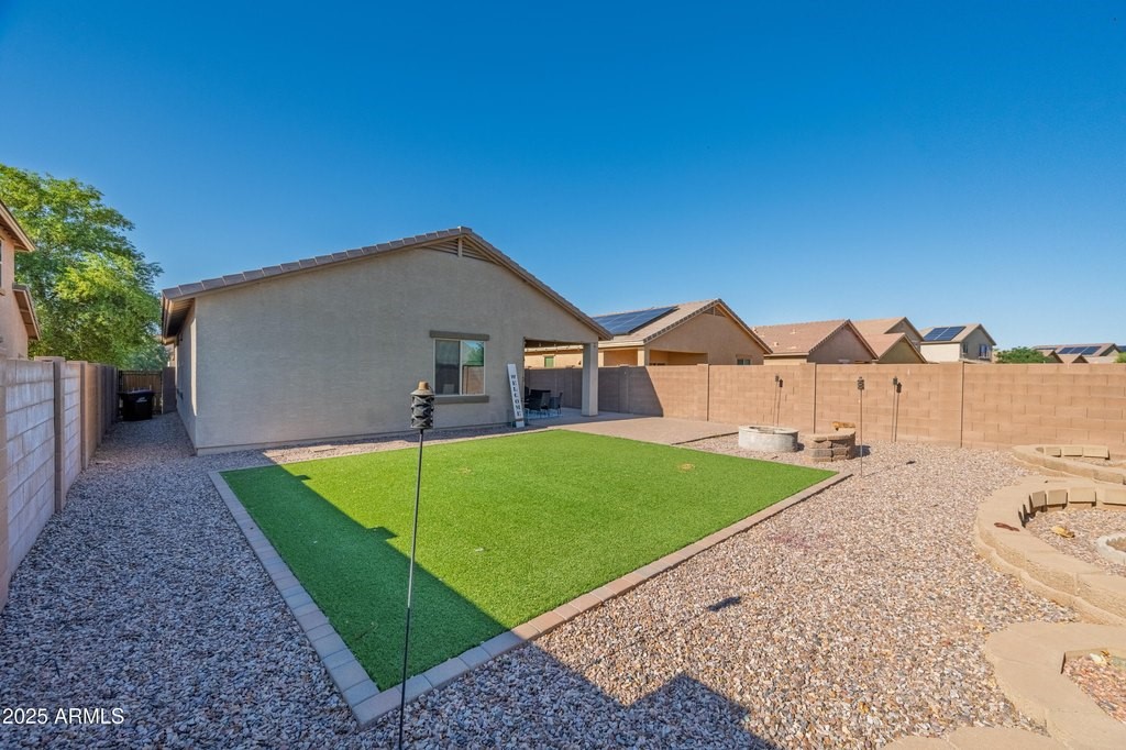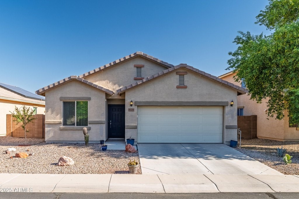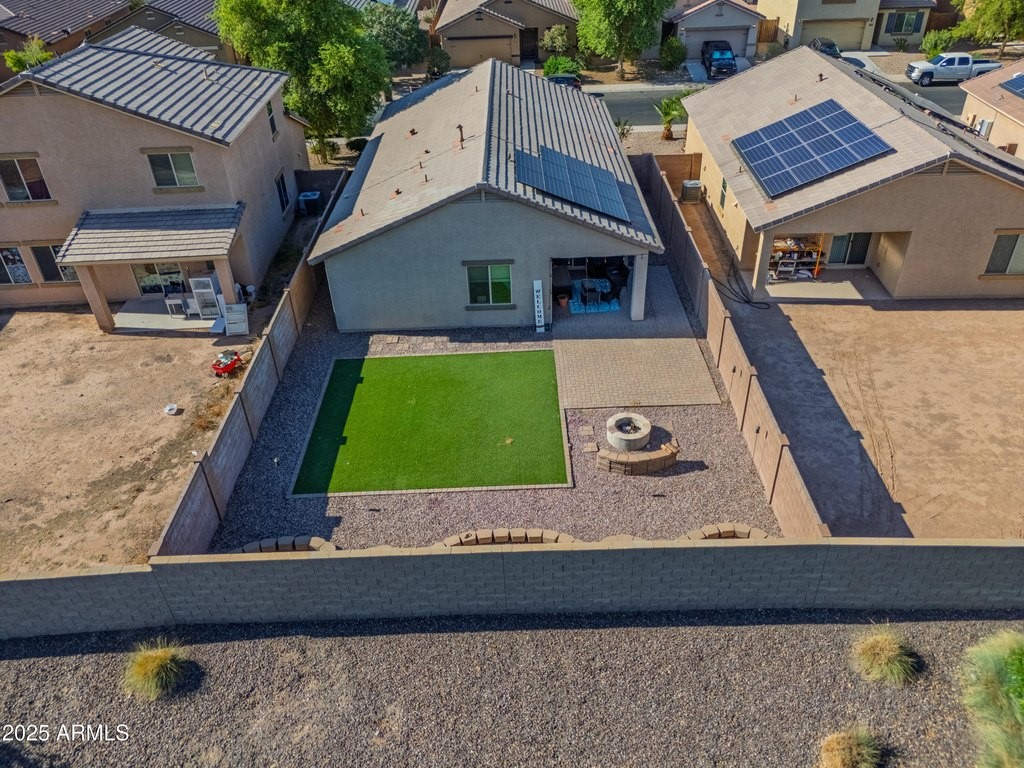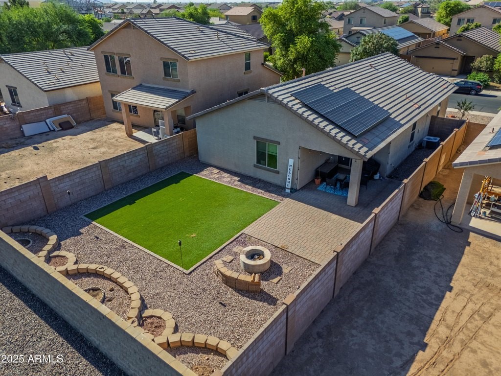 This well-maintained 3-bedroom, 2-bath home in Maricopa is just a short walk to the community pool! The kitchen features granite countertops, black appliances, a breakfast bar, and plenty of cabinet space, along with a separate dining area. The spacious primary suite includes a private toilet room, separate shower and tub, and generous closet space. Inside, you'll find a mix of laminate tile, carpet, faux wood blinds, and ceiling fans throughout. The low-maintenance front and back yards make life easy. The backyard is perfect for relaxing or entertaining, with a covered patio, extended paver area, firepit, and artificial turf. All appliances are included, and the home has solar panelsgreat for keeping electric bills down. Conveniently located near schools, shopping and dining!