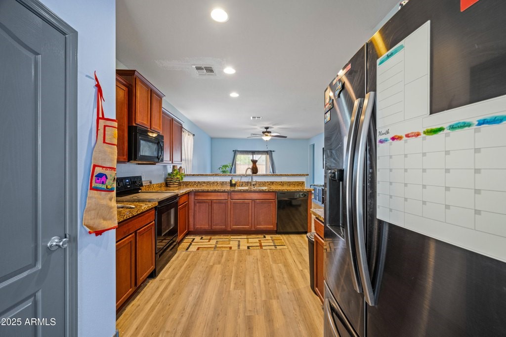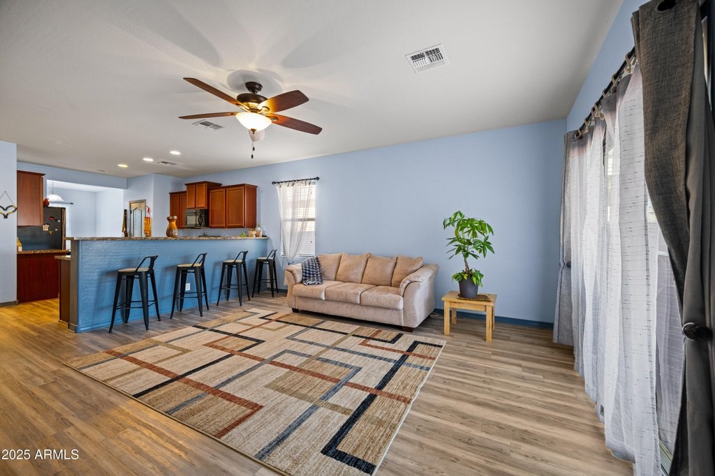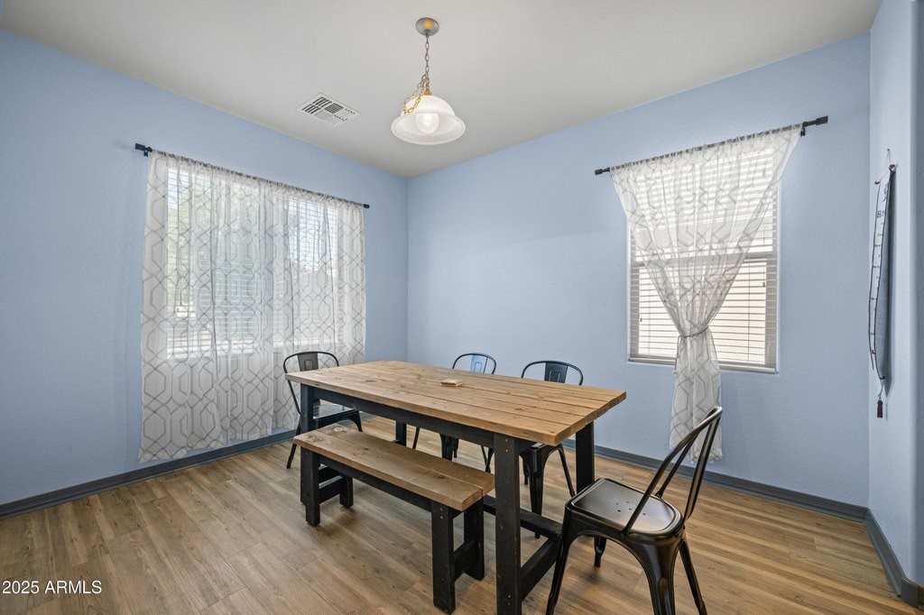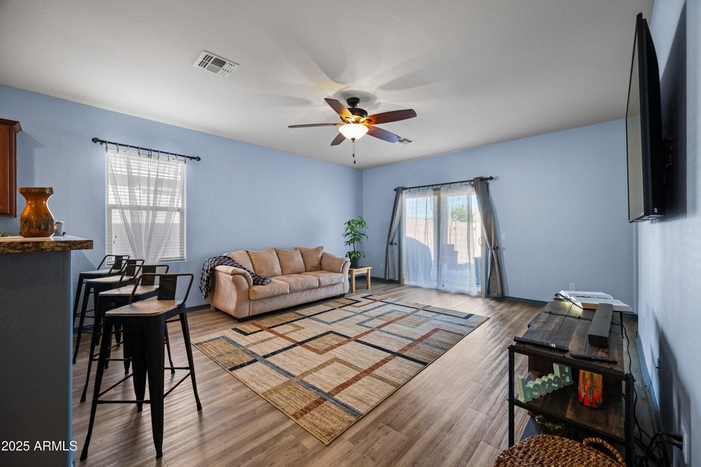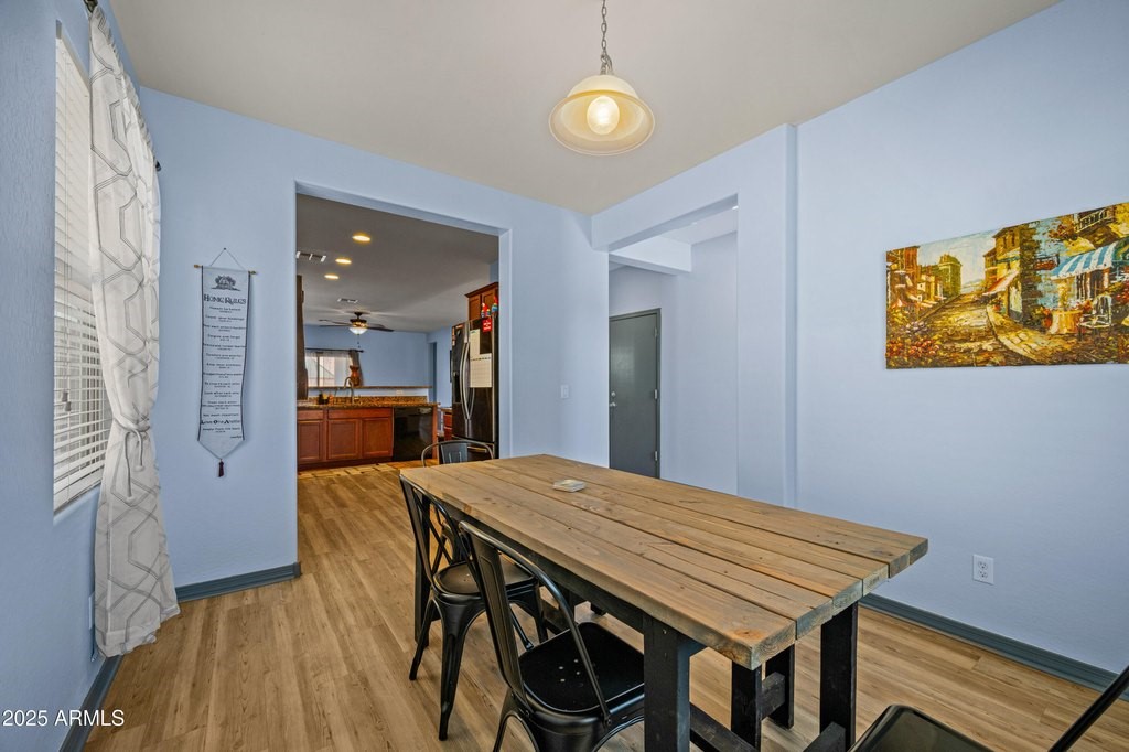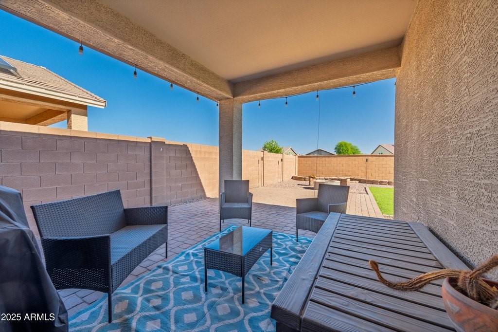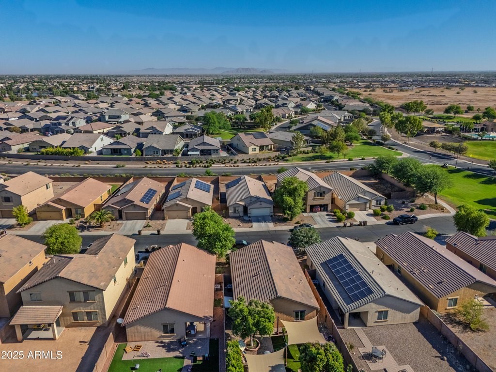 This well-maintained 3-bedroom, 2-bath home in Maricopa is just a short walk to the community pool! The kitchen features granite countertops, black appliances, a breakfast bar, and plenty of cabinet space, along with a separate dining area. The spacious primary suite includes a private toilet room, separate shower and tub, and generous closet space. Inside, you'll find a mix of laminate tile, carpet, faux wood blinds, and ceiling fans throughout. The low-maintenance front and back yards make life easy. The backyard is perfect for relaxing or entertaining, with a covered patio, extended paver area, firepit, and artificial turf. All appliances are included, and the home has solar panelsgreat for keeping electric bills down. Conveniently located near schools, shopping and dining!